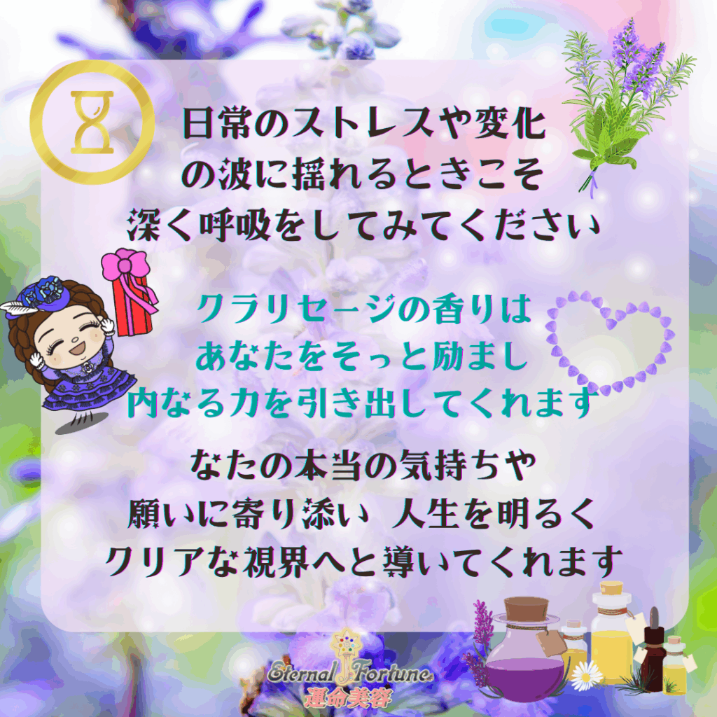 香りを通じて、自分の本音や願いに気づく時間。そんな静かな対話のひとときを与えてくれるクラリセージは、まさに“内なる叡智に導かれる精油”と言えるでしょう。