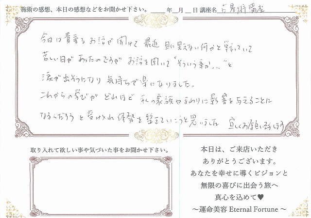苦しい目があったのですがお話を聞いて「そういう事か…」と