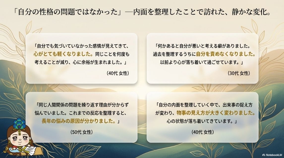 原因が理解できることで、自分自身に対する見方も変わり、人間関係や出来事への反応も少しずつ変化していきます。