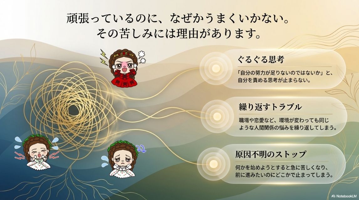 人間関係のトラブル、仕事の停滞、自信のなさ、不安の強さなど、状況は違ってもどこか似たようなパターンが続くと、「なぜ自分はいつもこうなるのだろう」と感じる方も少なくありません。