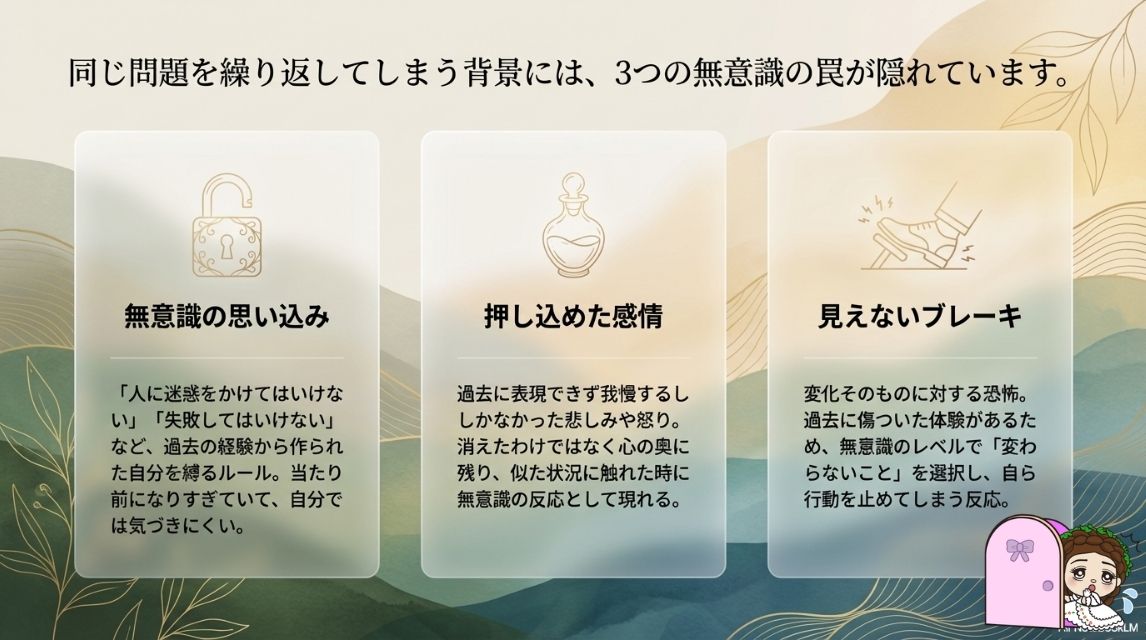 何度も似た問題を繰り返す背景には、無意識の思い込みや整理されていない感情が関わっていることがあります。