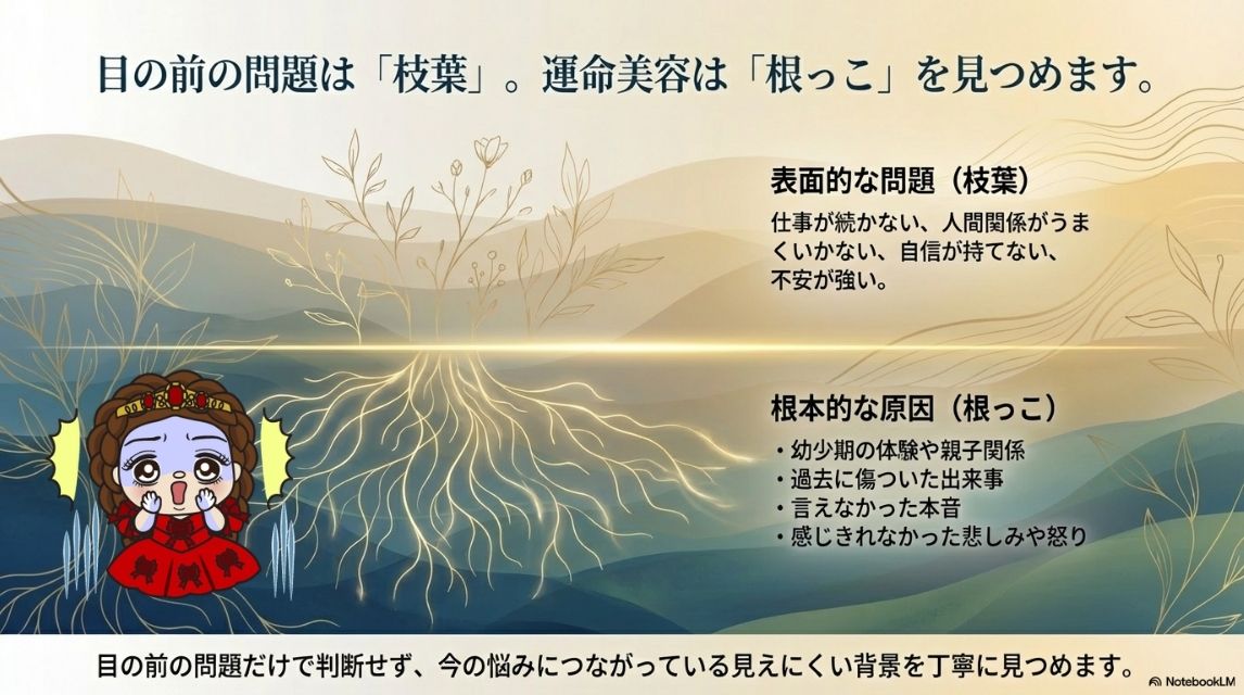 運命美容カウンセリングは、今あなたの目の前にある問題の「表面」だけを見るのではなく、その奥にある“根っこ”の部分を見つけていくことを大切にしています。