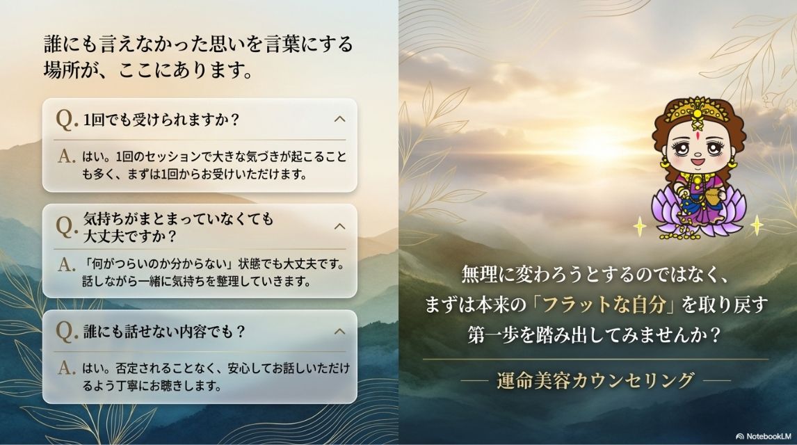 運命美容カウンセリングは、今の問題を表面的に処理するのではなく、その奥にある原因を見つけ、感情を整理しながら、心を本来のフラットな状態へ整えていくための時間です。