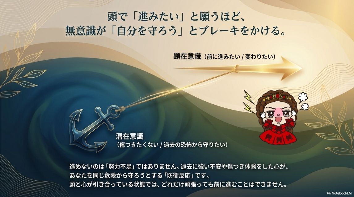 過去に傷ついた体験や強い不安を感じた経験があると、心は同じような状況から自分を守ろうとします。その結果、本当は進みたいと思っていても、無意識のレベルで止まってしまうことがあります。