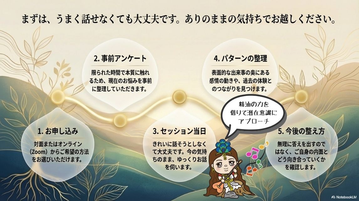運命美容カウンセリングでは、安心してご相談いただけるよう、事前準備からセッション当日まで丁寧に進めていきます。