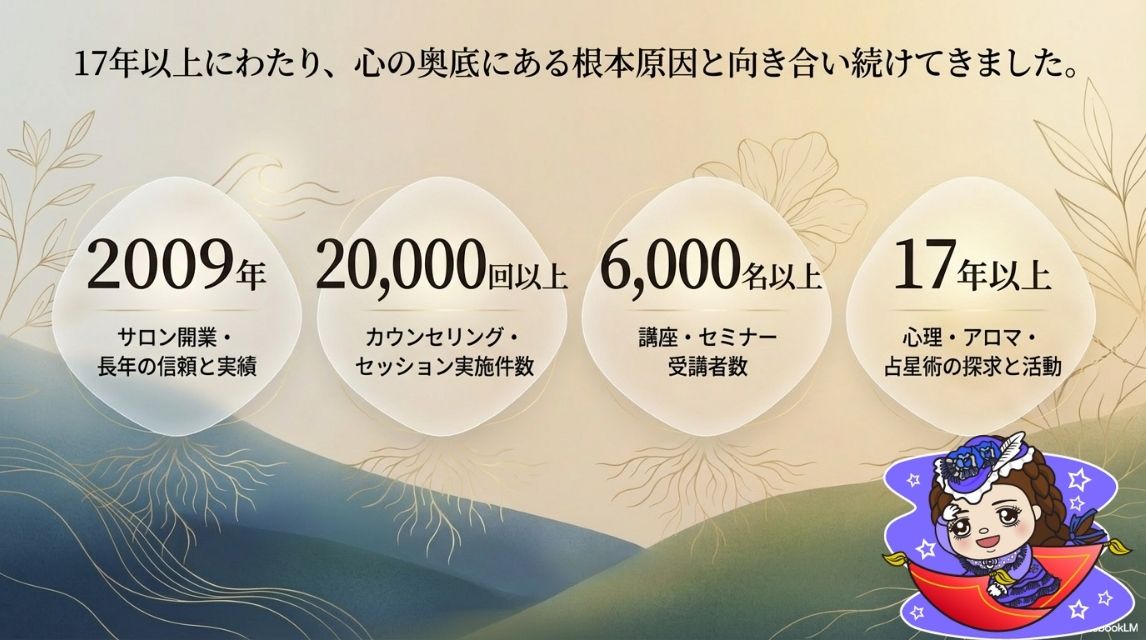 運命美容カウンセリングでは、今の問題の背景にある根本原因を丁寧に見つめていくことを大切にしています。1回のセッションの中で大きな気づきが起こることもありますし、必要に応じて継続的に心の整理を進めていくことも可能です。
