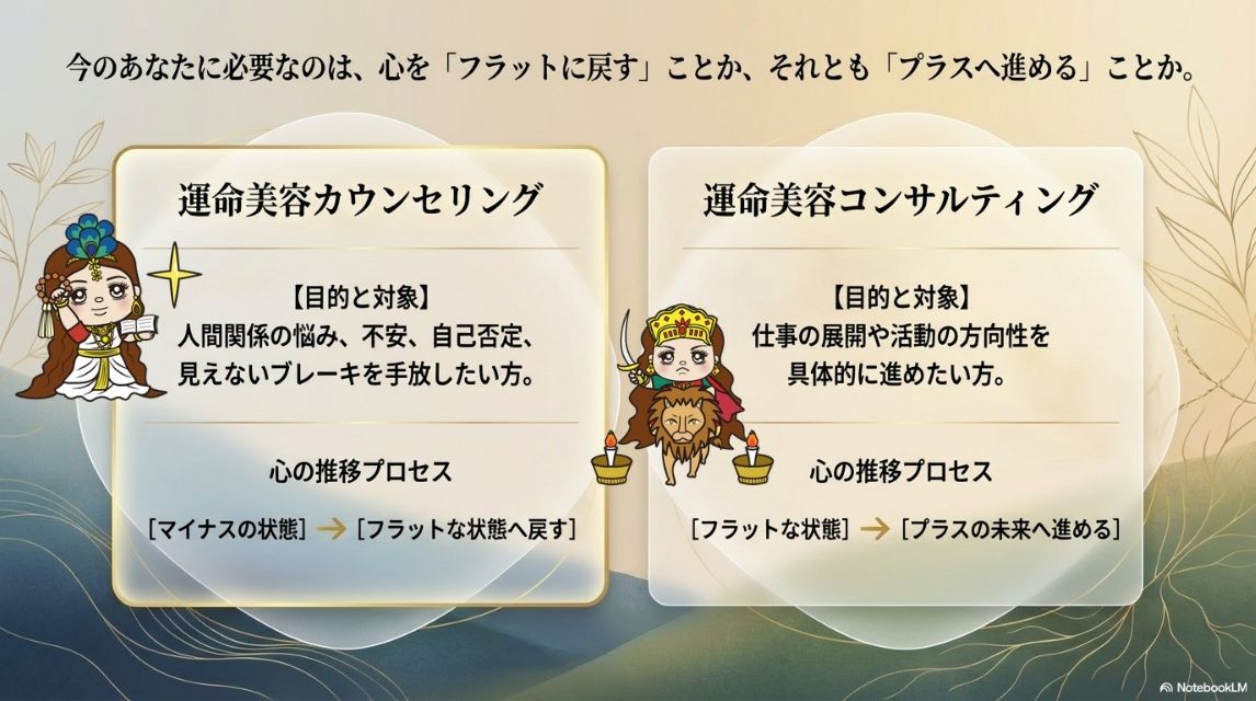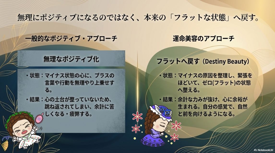 運命美容カウンセリングの目的は、無理にポジティブになることでも、すぐに答えを出すことでもありません。まずは、マイナスに傾いてしまった感情や、混乱した心の状態を、本来のフラットな状態へ戻していくことを目的としています。